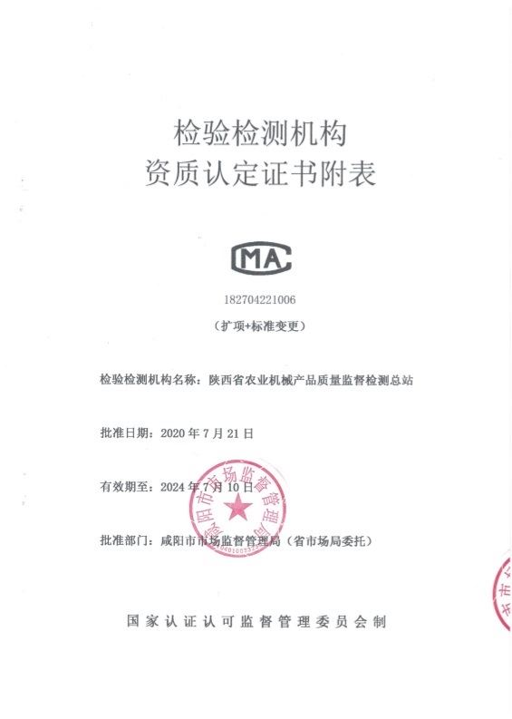 為了支持我省農(nóng)機(jī)企業(yè)發(fā)展,擴(kuò)大農(nóng)機(jī)行業(yè)檢測(cè)范圍,陜西省農(nóng)業(yè)機(jī)械產(chǎn)品質(zhì)量監(jiān)督檢測(cè)總站于近期進(jìn)行了資質(zhì)認(rèn)定擴(kuò)項(xiàng)及標(biāo)準(zhǔn)變更現(xiàn)場(chǎng)評(píng)審,并順利取得了資質(zhì)認(rèn)定證書。在“新冠肺炎疫情”期間,我站工作人員沒有一絲松懈,經(jīng)過前期多次培訓(xùn)學(xué)習(xí)、認(rèn)真準(zhǔn)備,在全站人員共同努力下順利完成了一次新的考驗(yàn)。