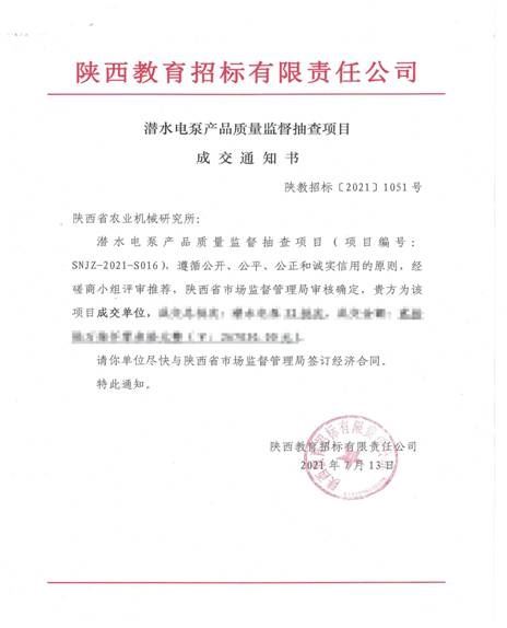陜西省農機質檢總站成功中標2021年潛水電泵質量監督抽查項目