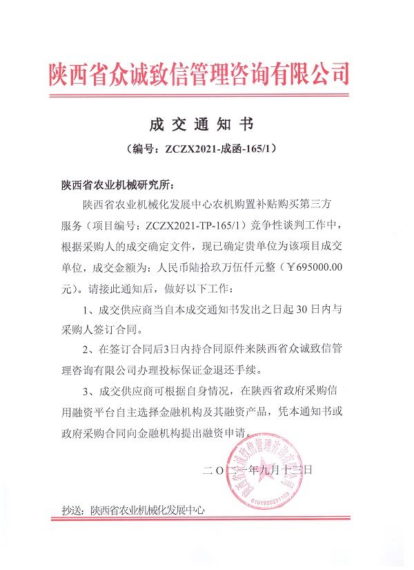 根據陜西省農業機械化發展中心農機購置補貼購買第三方服務競爭性談判公告(項目編號:ZCZX2021-TP-165/1),我所迅速組織人員團結協作,高效地完成了響應文件的編制,并按期遞交至陜西省眾誠致信管理咨詢有限公司。最終經談判小組評審推薦,確定我所為該項目供應商。