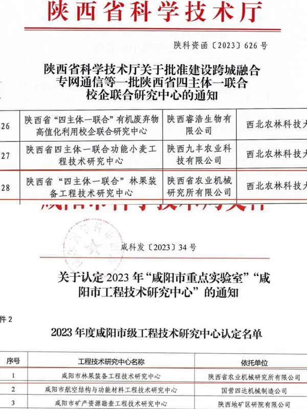 喜報~陜西省農業機械研究所有限公司獲批組建陜西省“四主體一聯合”林果裝備校企聯合研究中心、咸陽市林果裝備工程技術研究中心