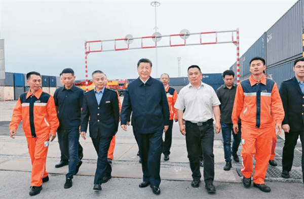 2024年4月22日至24日,中共中央總書記、國家主席、中央軍委主席習近平在重慶考察。這是22日下午,習近平在重慶國際物流樞紐園區重慶鐵路集裝箱中心站,同貨車司機、列車司機、裝卸工人、場站管理人員等親切交流。新華社記者 王曄 攝
