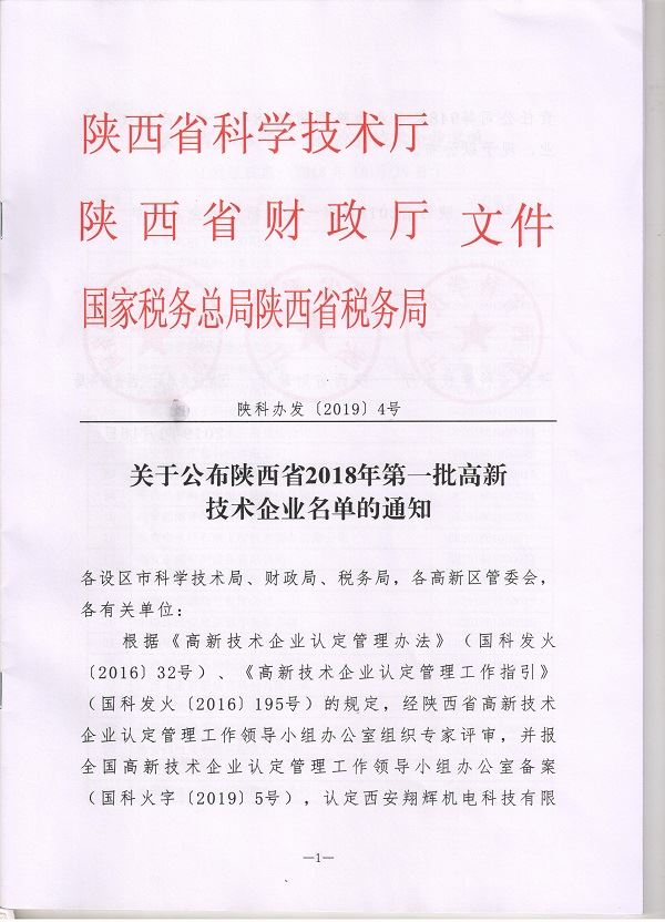 陜西省農業機械研究所通過陜西省2018年第一批高新技術企業認定