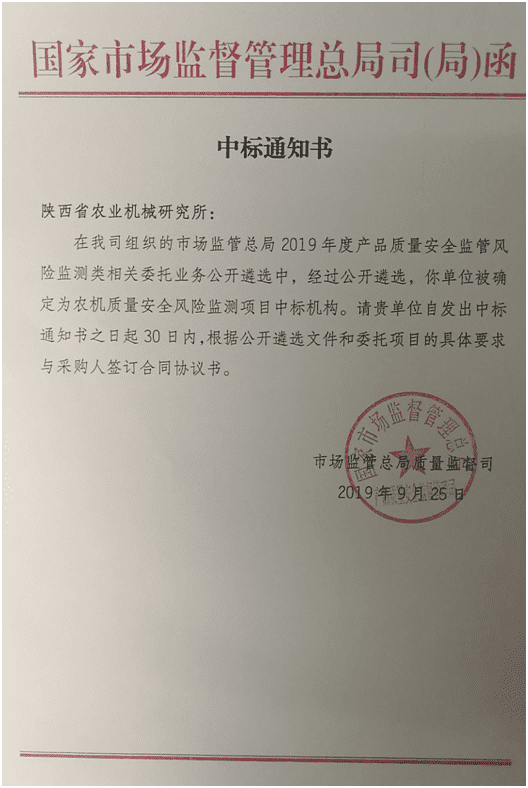 通過國家市場監(jiān)管總局質(zhì)量監(jiān)督司2019年度產(chǎn)品質(zhì)量安全監(jiān)管風(fēng)險監(jiān)測類相關(guān)委托業(yè)務(wù)公開遴選,陜西省農(nóng)業(yè)機械研究所(陜西省農(nóng)業(yè)機械產(chǎn)品質(zhì)量監(jiān)督檢測總站)成功中標,成為全國農(nóng)機產(chǎn)品質(zhì)量安全風(fēng)險監(jiān)測項目承檢機構(gòu)。這是我所繼成功中標國家級產(chǎn)品質(zhì)量監(jiān)督抽查任務(wù)之后的又一重大喜訊!